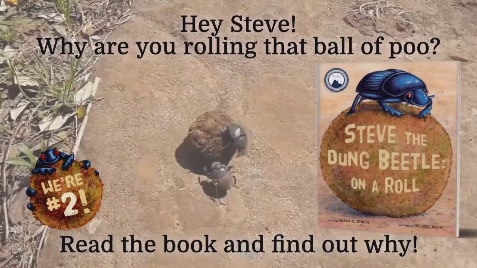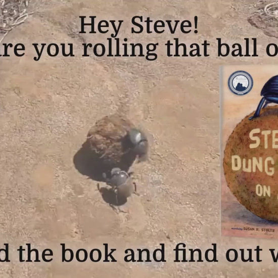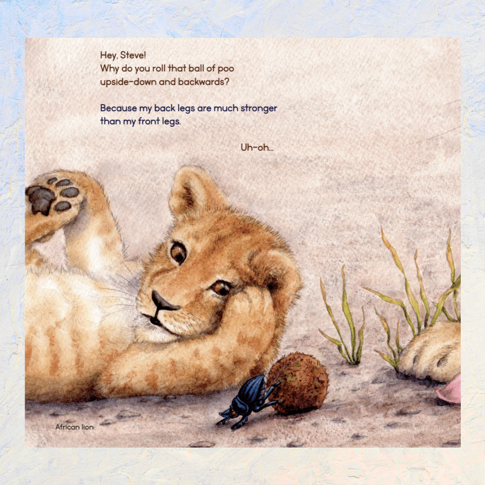 Roll that ball of poo home.Everyone wants to know what Steve is up to on his journey home. The elephant, giraffe, and warthog, among others, ask the same thing, "Why are you rolling that ball of poo? As he makes his way home, Steve teaches the other animals about why his job is so important to the environment and to all the other animals!